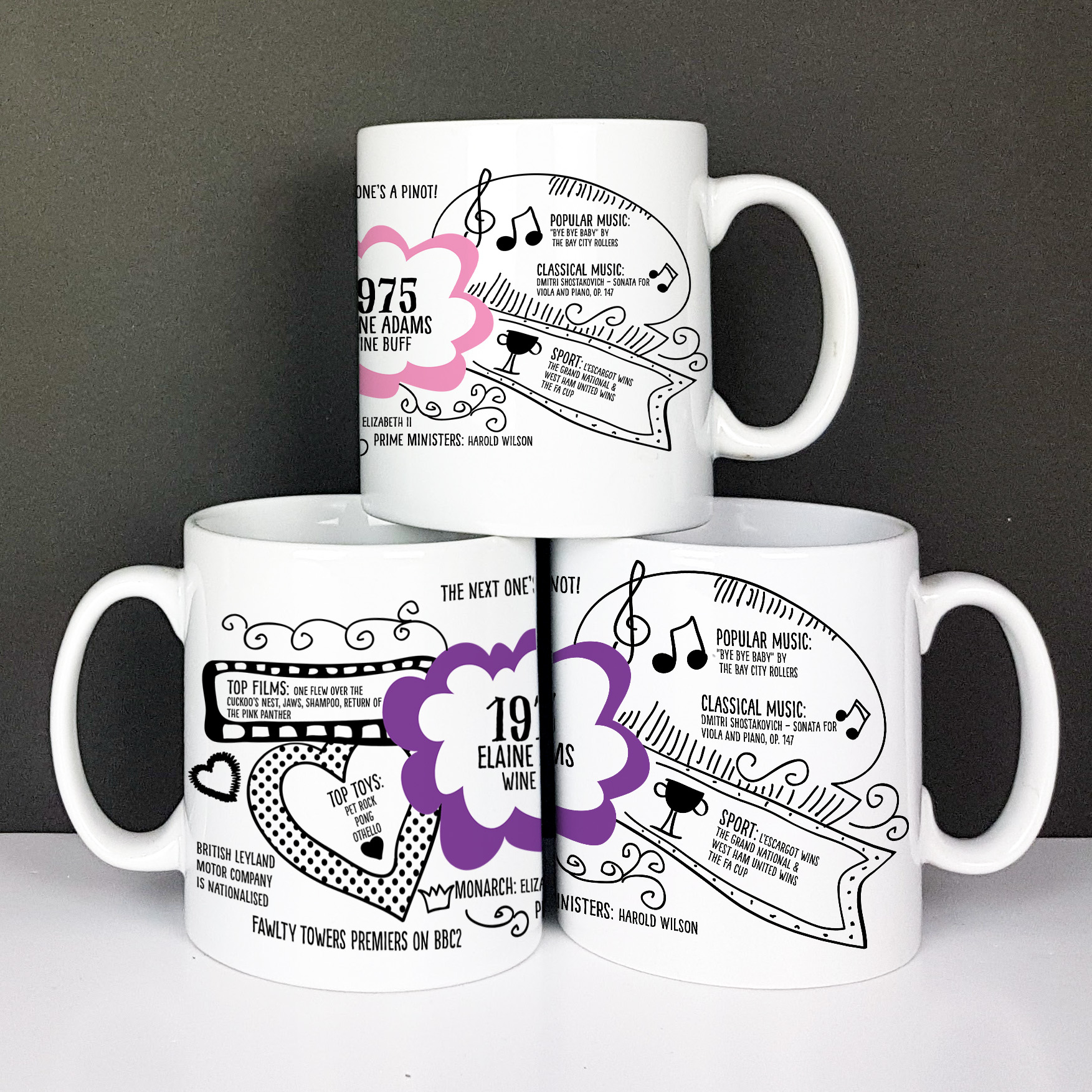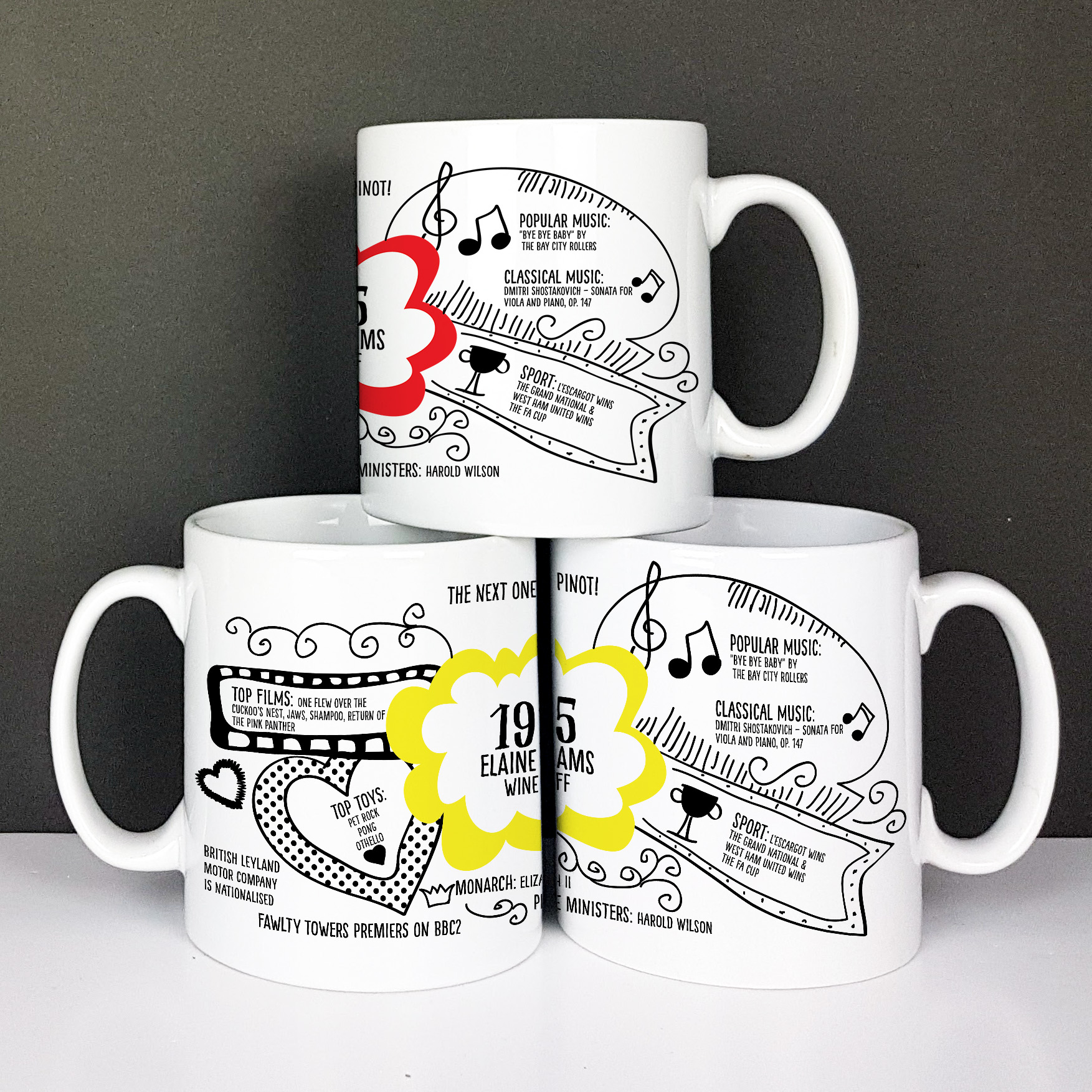 What was an extraordinary year - the recipient will be reminded of all that happened in the year they were born, whenever they have a nice cup of tea!Look very closely and you will see all sorts of fascinating information. And... taking pride of place under "1975" you can add the name of the birthday boy or girl.