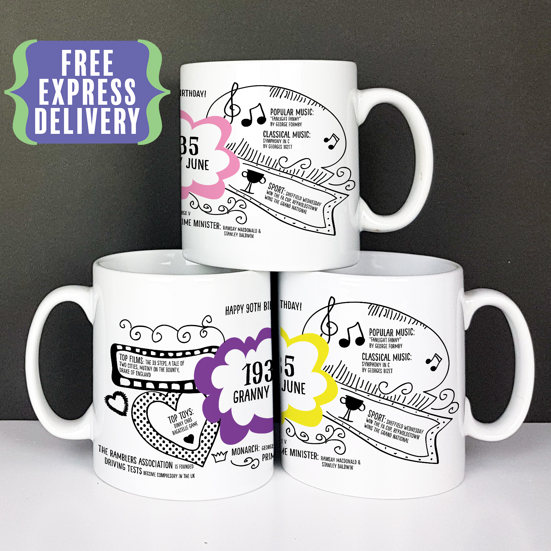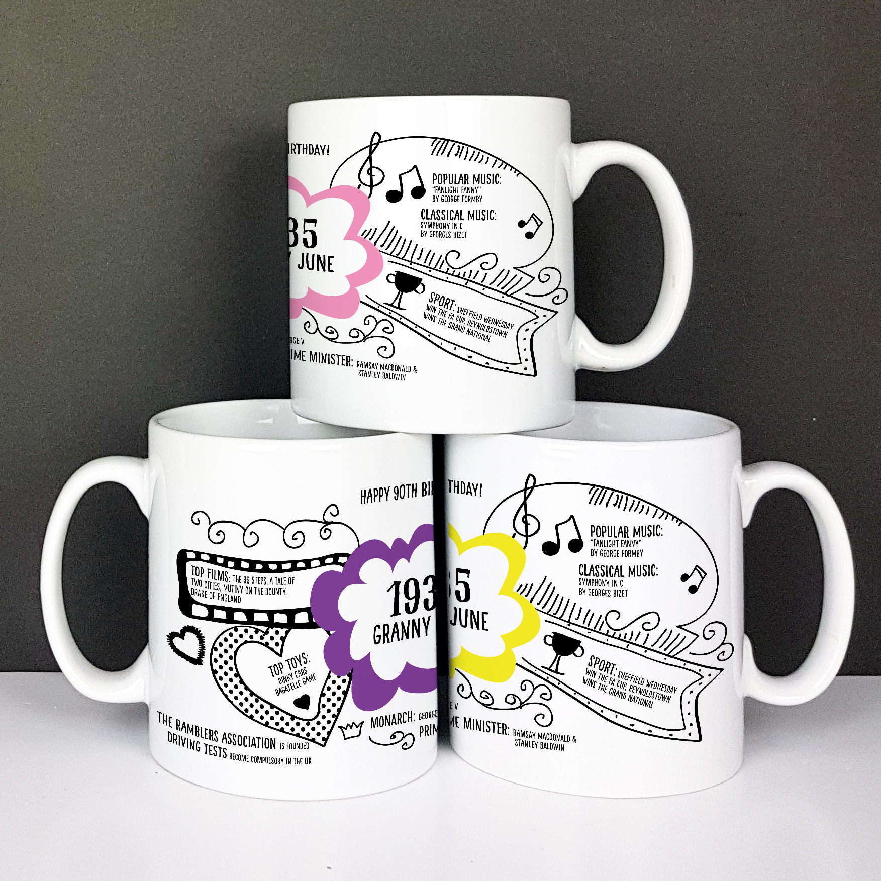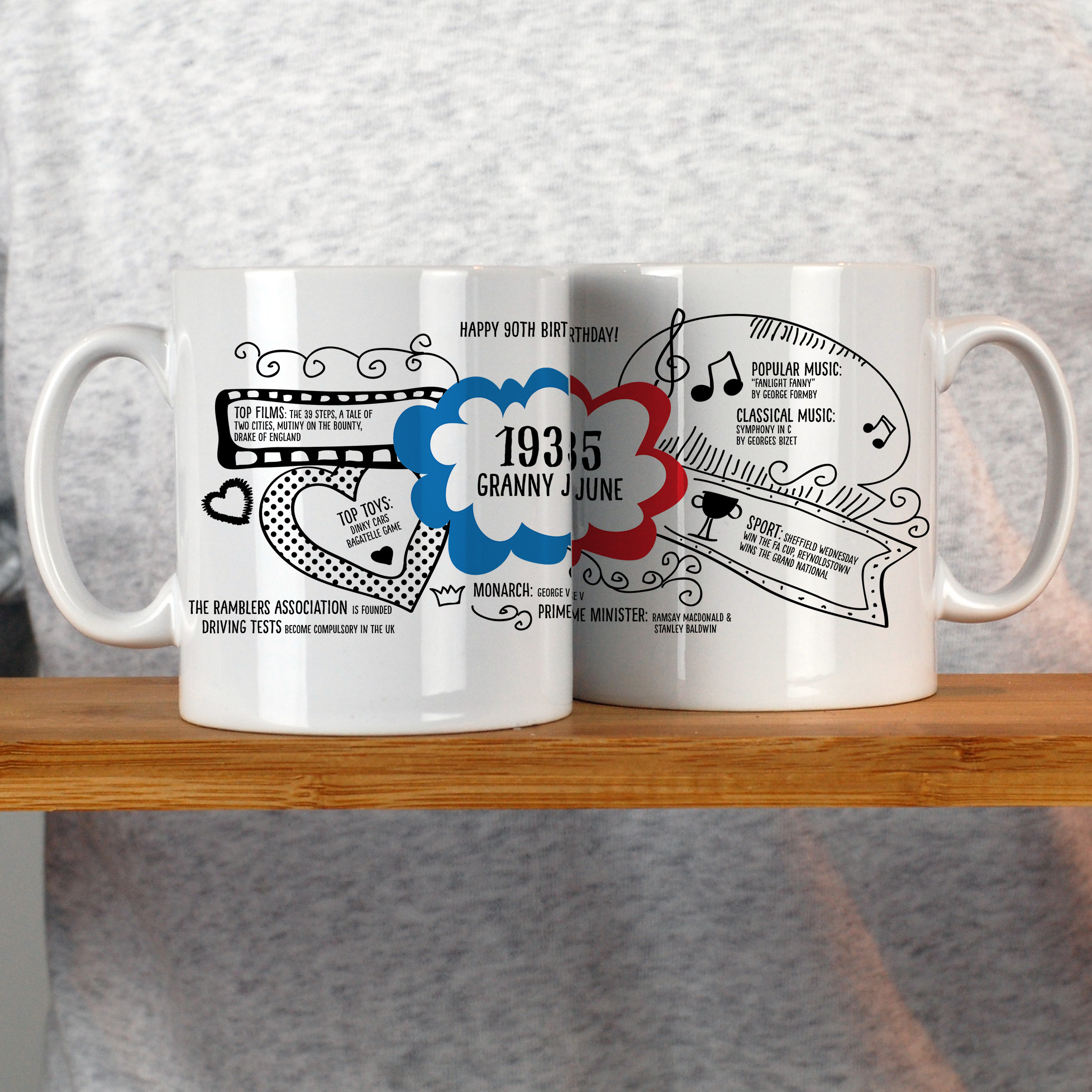 What a year 1935 was! This personalised 90th Birthday mug records key events in the United Kingdom and worldwide making a special birthday gift for him or her.