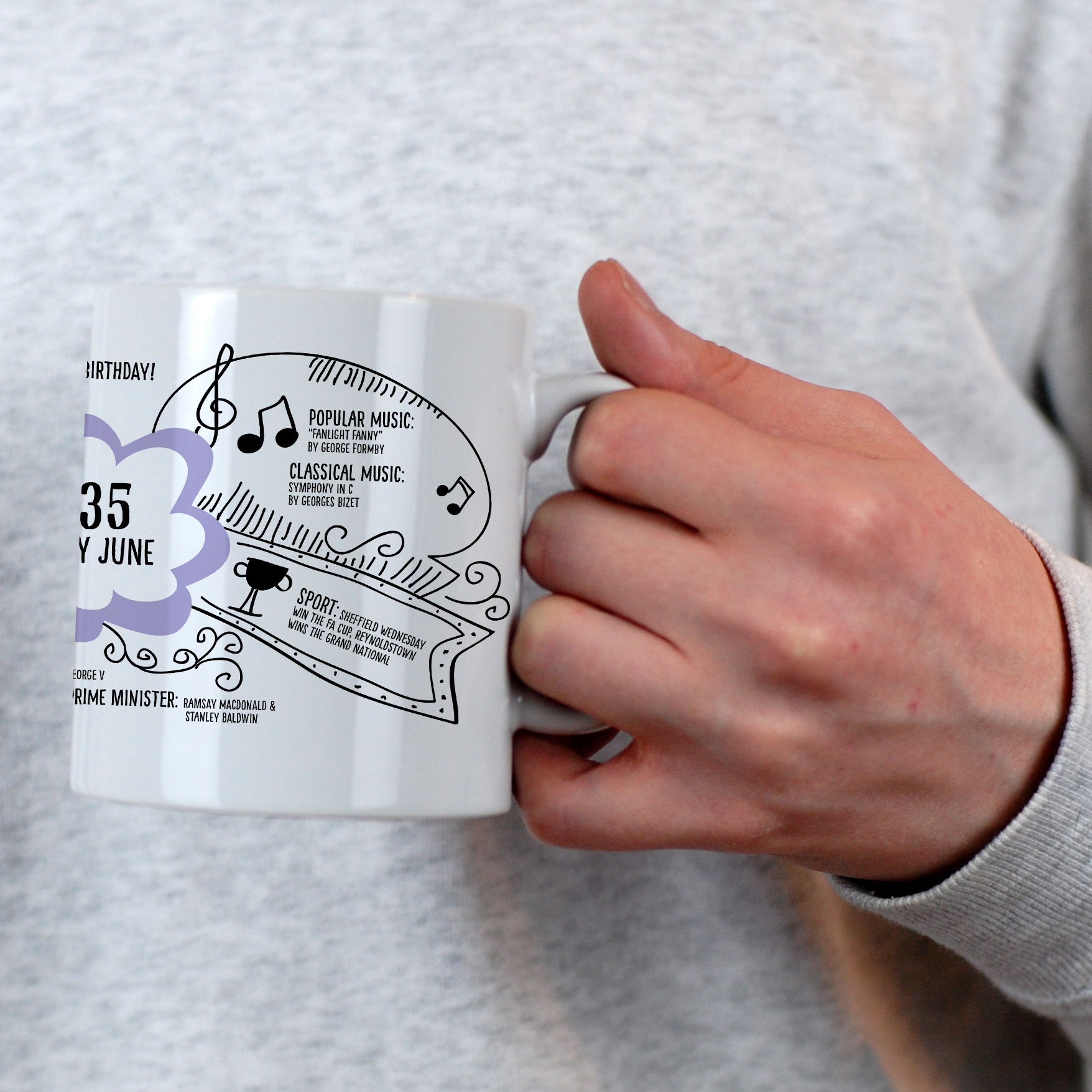 What an extraordinary year - the recipient will be reminded of all that happened in the year they were born, whenever they have a nice cup of tea!Look very closely and you will see all sorts of fascinating information. And... taking pride of place under "1935" you can add the name of the birthday boy or girl.