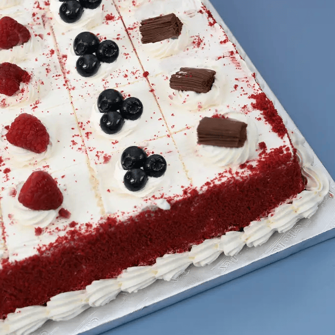 Experience the ultimate treat with our rich red velvet sponge base, perfectly moist and full of flavour.