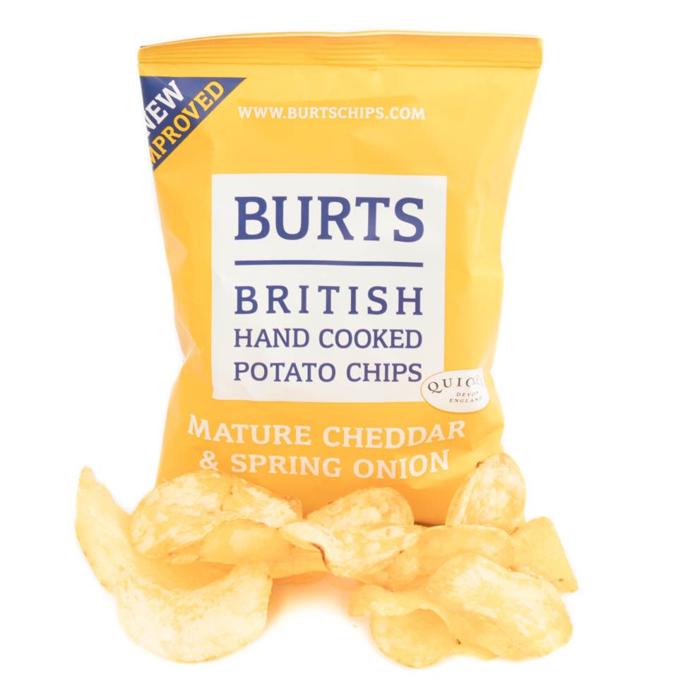 - Burts Vintage Cheddar Crisps (40g)– seasoned with vintage cheddar and a pinch of natural sea salt for a truly tasty flavour.