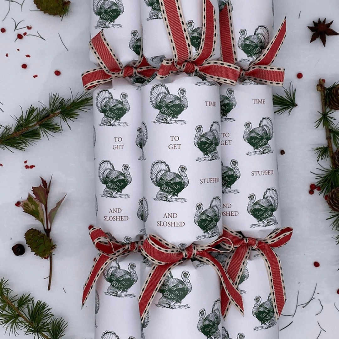 A crisp snow white cracker hand tied with a deep berry red ribbon and decorated with a splendid festive green turkey. Inside, the matching design tin holds a seasonal gin with bright notes of orange, nutmeg, allspice and juniper, perfect for raising a glass at Xmas..