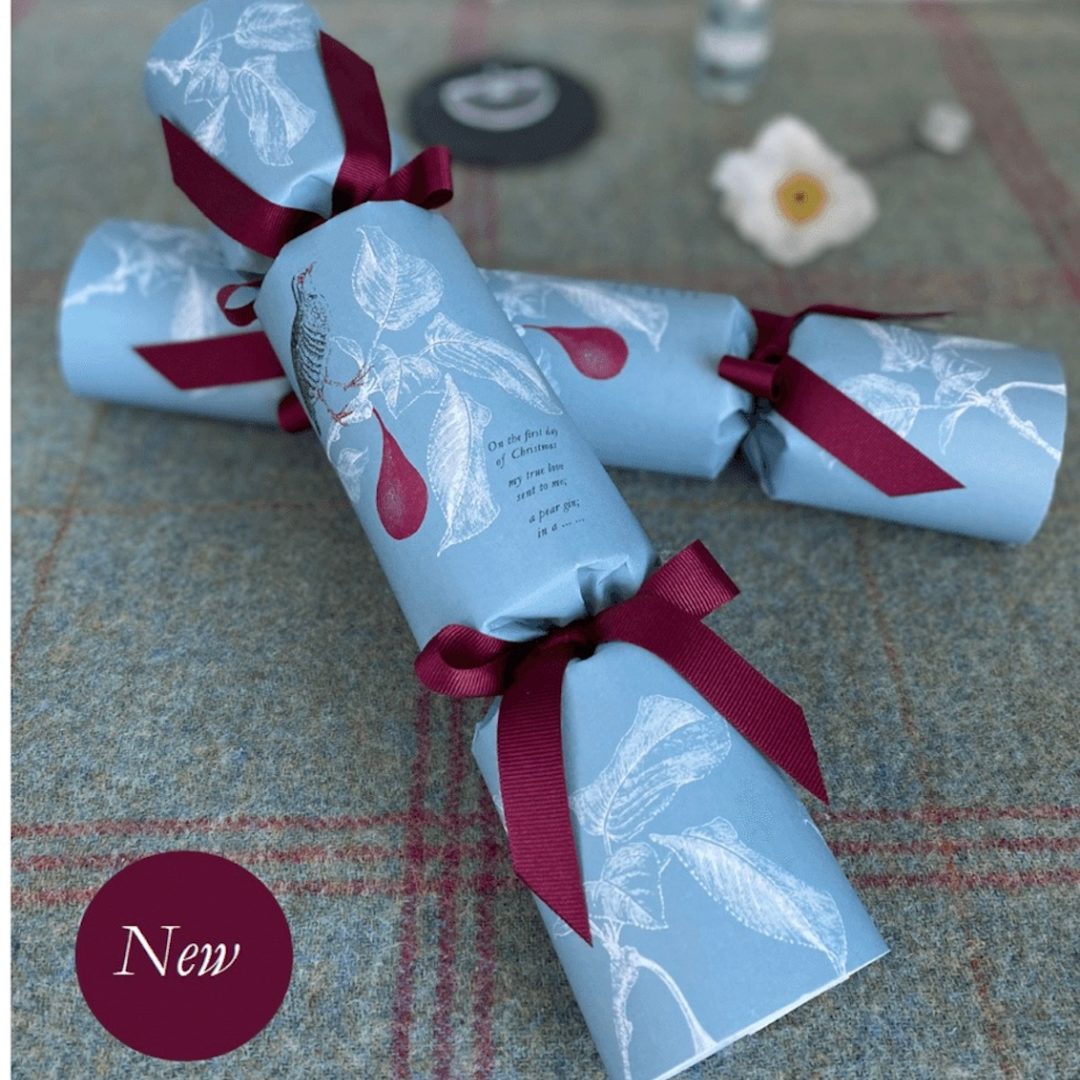 A charming cracker in duck egg blue with a deep claret ribbon, featuring a delicate partridge and pear design. Inside is a spiced gin with packham pear, cinnamon and orange peel capturing the warmth and flavour of the season.