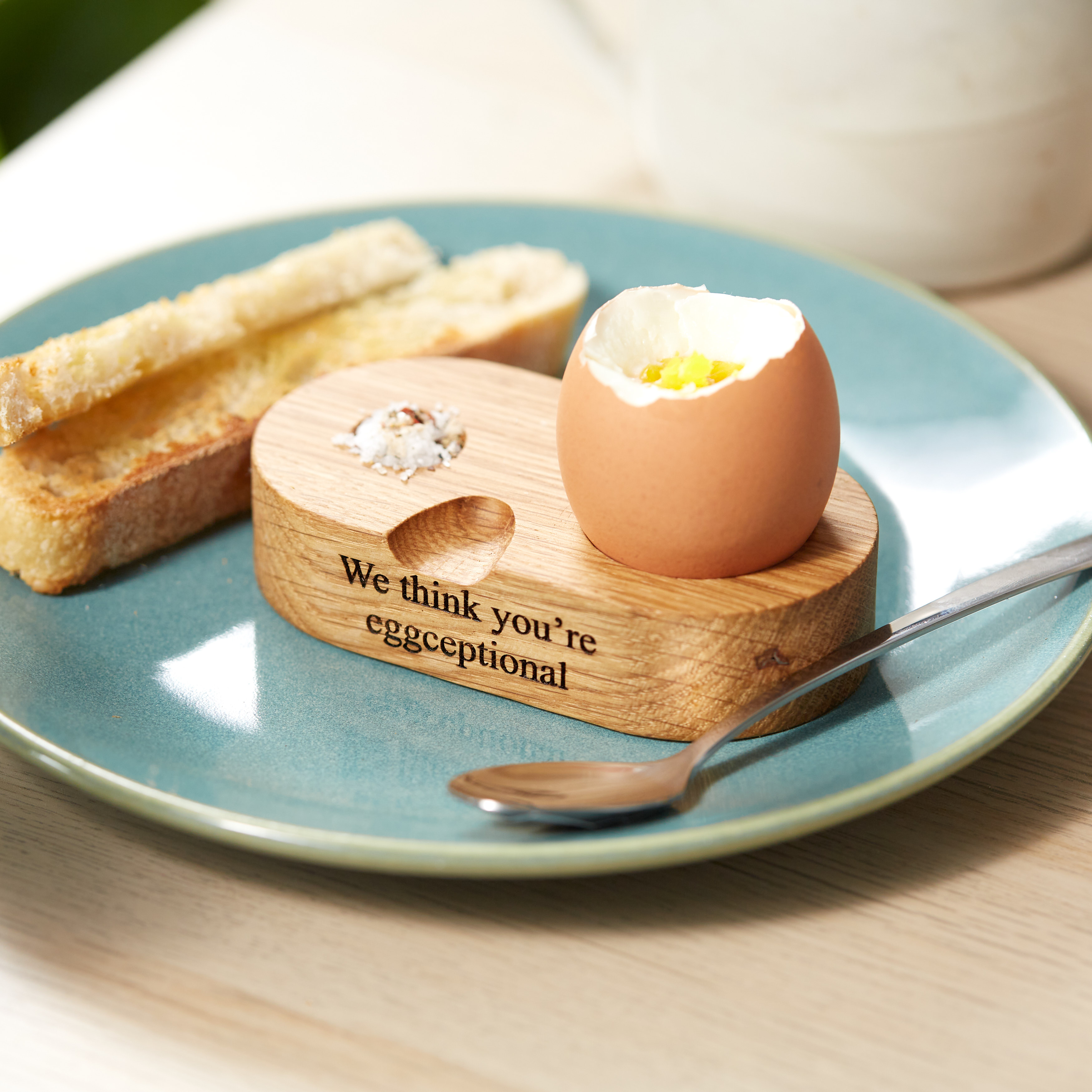 A contemporary UK crafted personalised solid oak egg cup with salt dip and spoon tray to make the perfect gift for your egg lover.