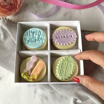 These personalized hand-iced biscuits are sure to bring joy when they arrive through the letterbox as a delightful birthday surprise. You receive 12 lovely soft biscuits in the box, each biscuit will feature stamped messages, and you can personalize one biscuit with a name.