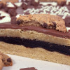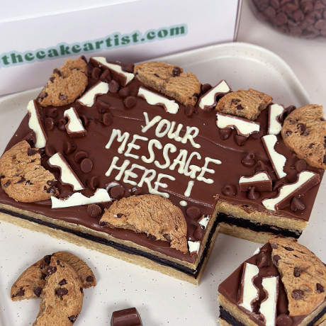 The Colossal Personalised Cookie Slab is made up from: A layer of cookie, blondie, Maryland cookies, brownies and blondie. Finished with milk chocolate, cookie crumb, kinder chocolate, edible gold leaf, white chocolate and milk chocolate hand piped personalised message.