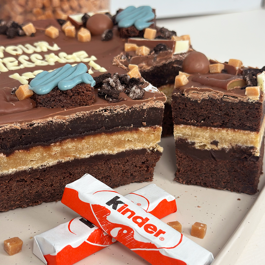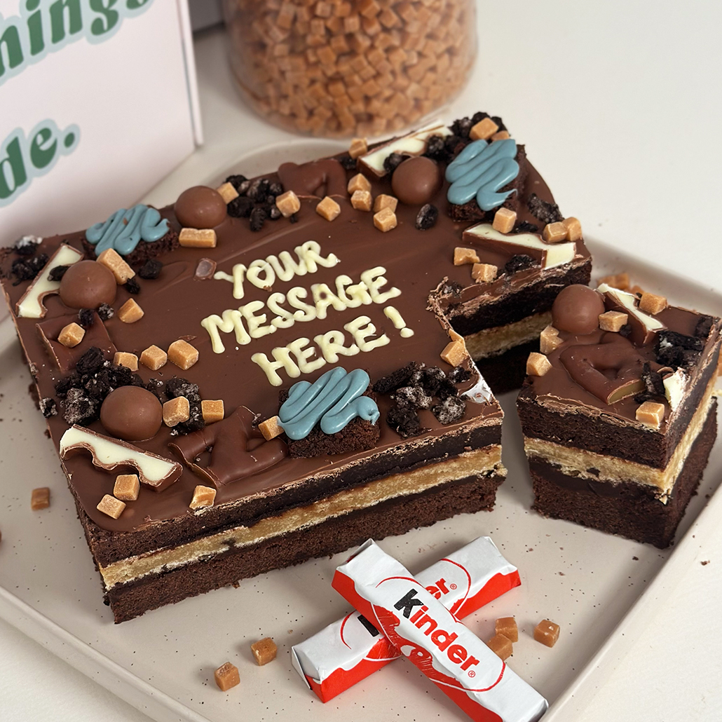 Topped with milk chocolate, Oreos bits, kinder, Maltese's, curly curly, mini brownie bites, caramel chunks and a hand piped personalised message!