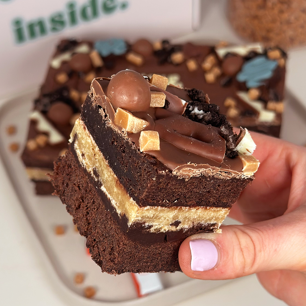 sugar, butter, cocoa powder, plain flour, eggs, vanilla extract, brown sugar, white chocolate, milk chocolate, oreo bits, curly wurly, food colouring, Malteser's, kinder, caramel chunks and the following filling choice: chocolate spread, chocolate spread with salted caramel, biscoff spread or hazelnut spread (contains nuts)
