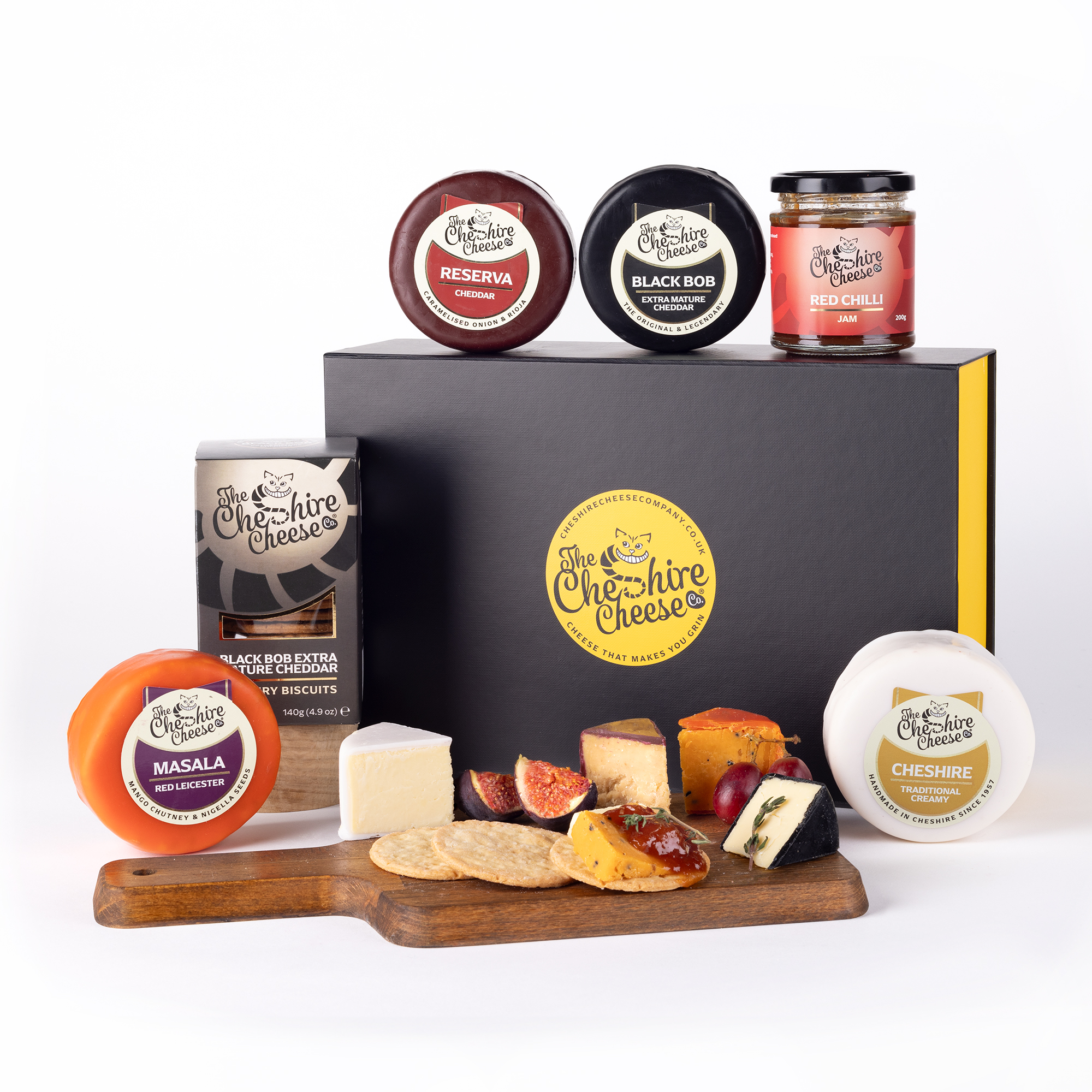We’ve included four of our most loved award-winning waxed cheeses, our delicious Black Bob Mature Cheddar Biscuits and our Caramelised Onion Chutney, nestled in wood wool our brand new gift boxes – making this a truly decadent gift!