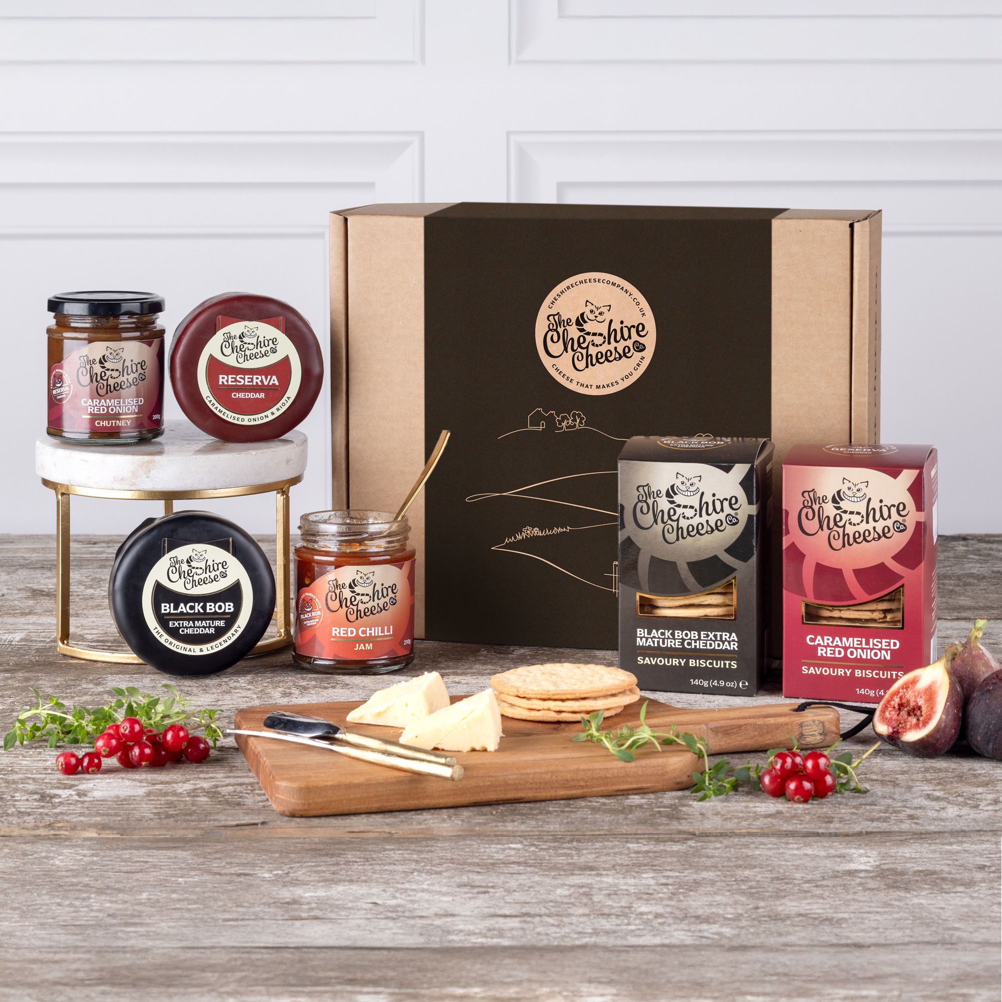 Carefully packed in a contemporary and recyclable box and nestled in wood wool, you will find our best-selling 200g cheese truckles, Black Bob Extra Mature Cheddar and Reserva, Caramelised Onion and Rioja cheddar truckles. With their matching biscuit flavours and perfectly matched chutneys... expect big taste sensations!