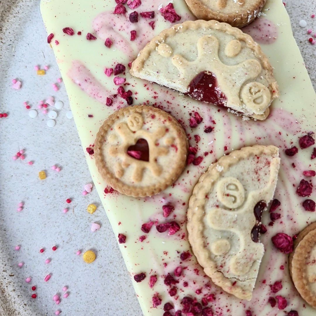 White chocolate swirled with pink raspberry flavoured chocolate, topped with Jammy Dodgers (big and mini) and freeze-dried raspberry pieces.
