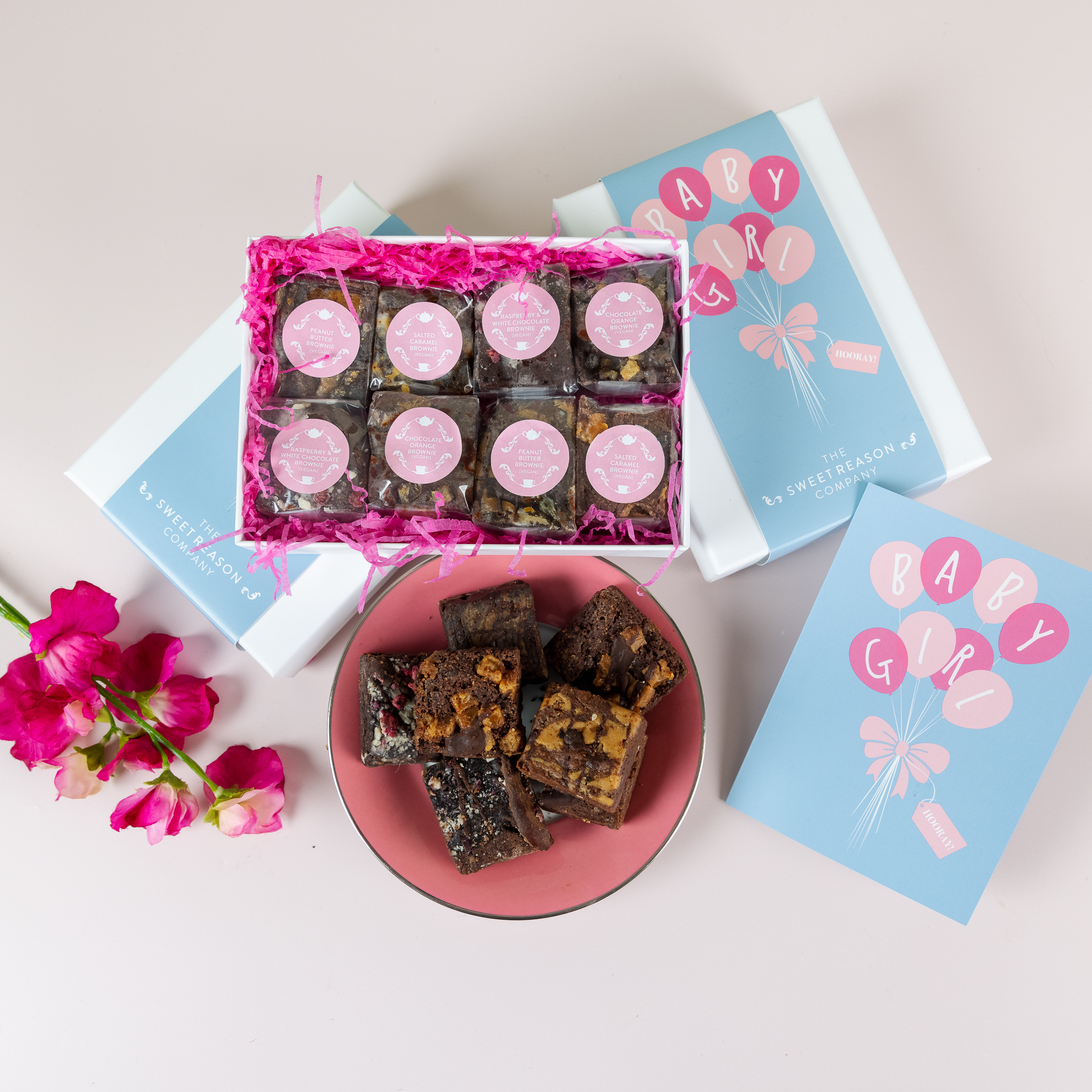 Our 'Baby Girl' Gluten Free Luxury Brownie Gift delivered straight to their door with a personalised card so you can send a little note to say how excited you are for the new arrival.