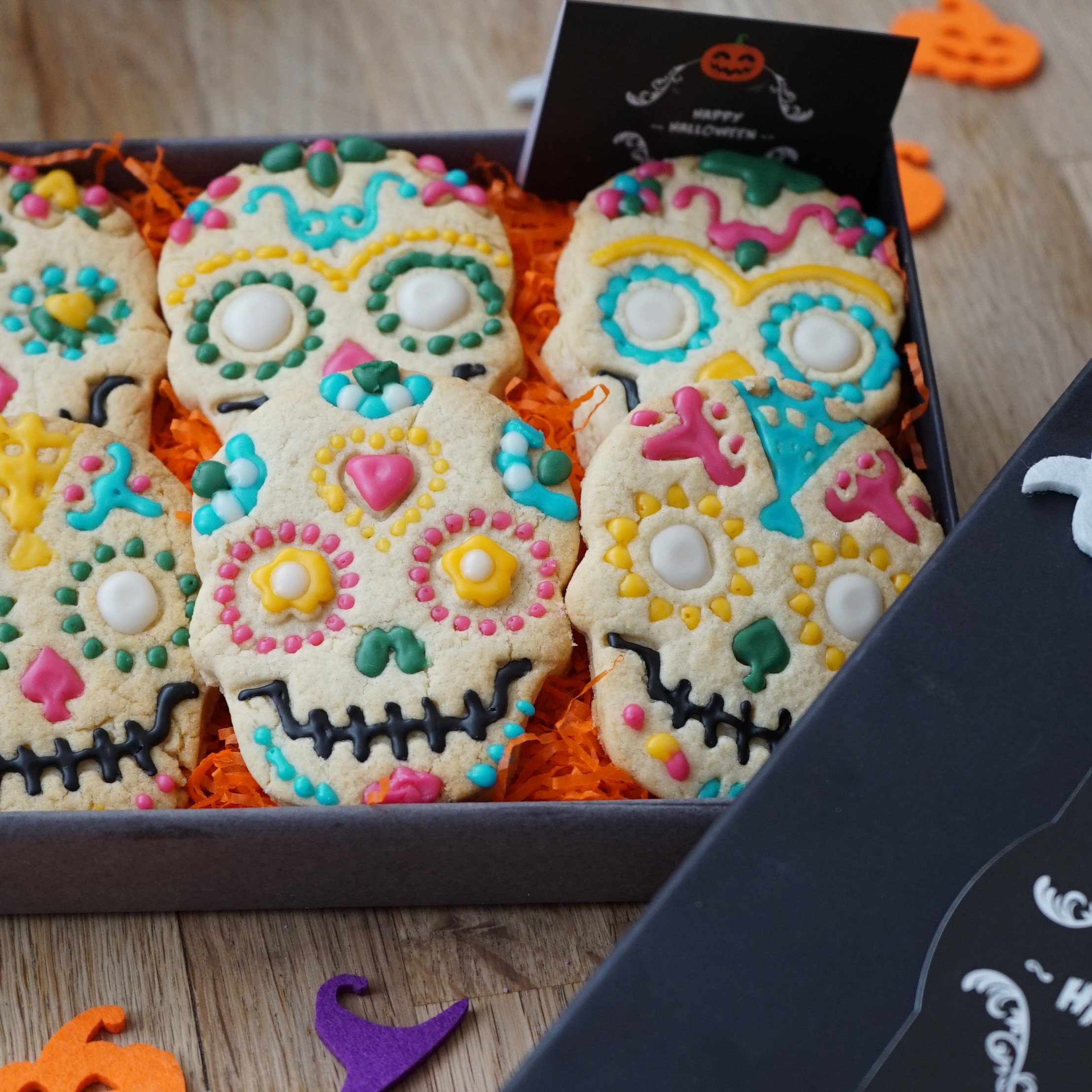 Our stunning but creepy hand made biscuits are presented in a beautiful luxury gift box. Each box is personalised with a Halloween greeting card for your own message.