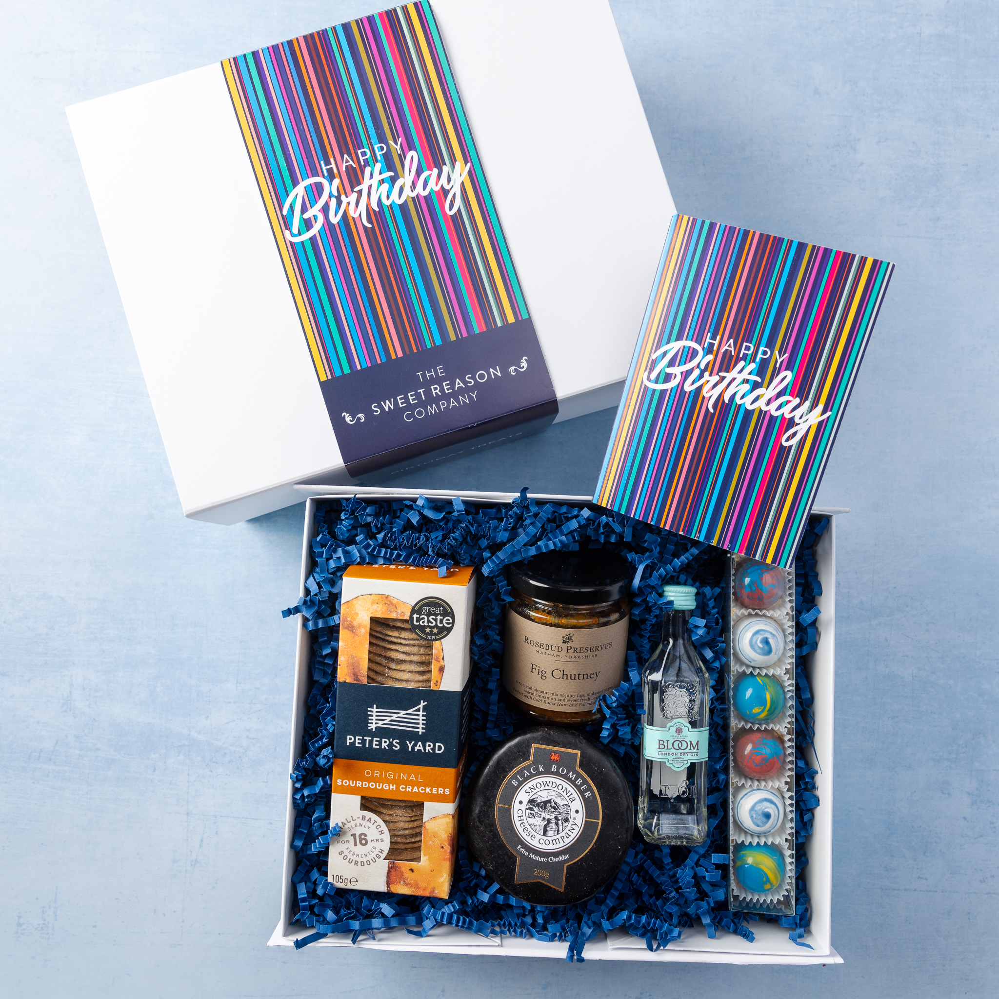 We created this gift box to stand out against the crowd with its striking designer-esque design. Filled with indulgent and delicious treats and a greetings card for your personal birthday message, it says ‘Happy Birthday’ perfectly.