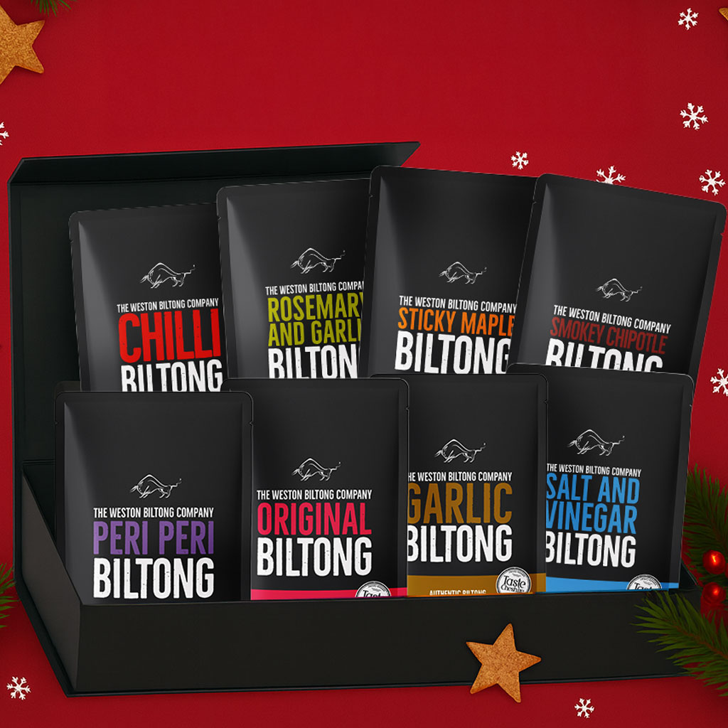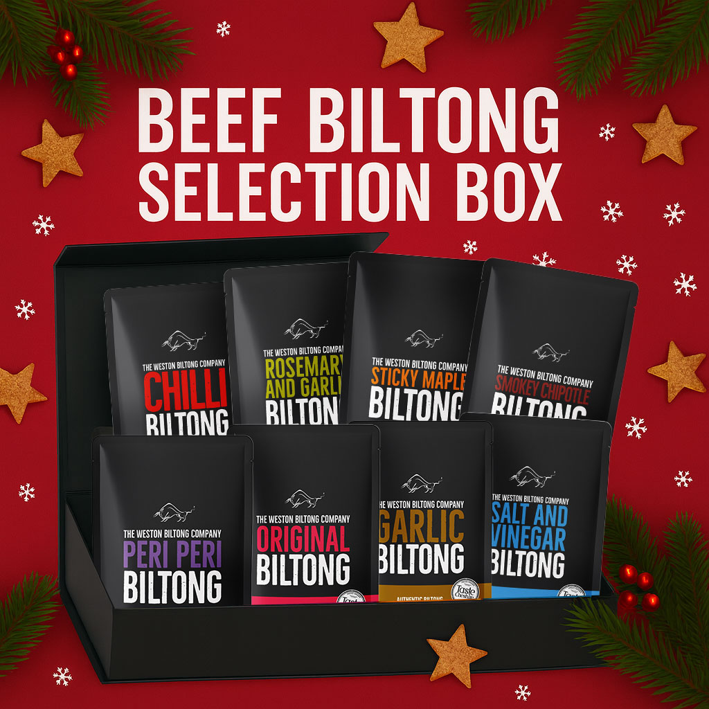 Experience the perfect Christmas present with our expertly crafted British beef biltong selection box from our friends at Weston Biltong, showcasing 8 unique flavours. Each slice is skilfully prepared using authentic South African techniques and premium British beef, offering a distinctive flavour profile rarely encountered elsewhere.