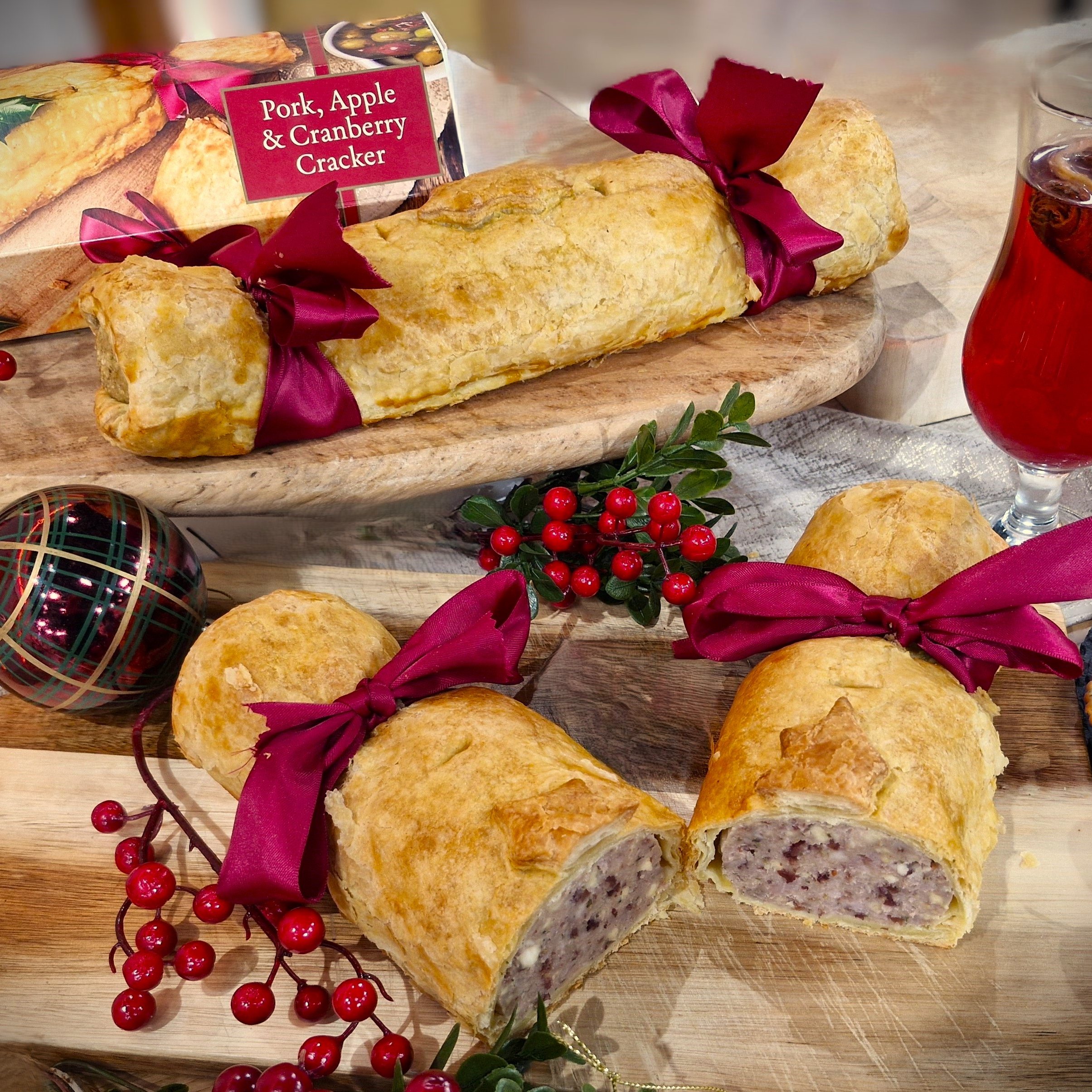 The Ultimate Collection Comprising two hand crafted sausage roll crackers: 1x 720g Pork Apple & Cranberry Sausage Roll Cracker Handmade, using British quality assured pork, a delicious apple and sage seasoning with dried cranberry and apple, herbs and spices all wrapped in buttery puff pastry with sage and onion stiffing balls in each end, Then 1x 720g Classic Cumberland Sausage Roll Cracker, Handmade, using British quality assured pork, Cumberland sausage seasoning, herbs and spices all wrapped in buttery puff pastry, with sage and onion stiffing balls at each end, but that’s not all every cracker comes with two pieces of hand cut silken ribbon to finish the look.