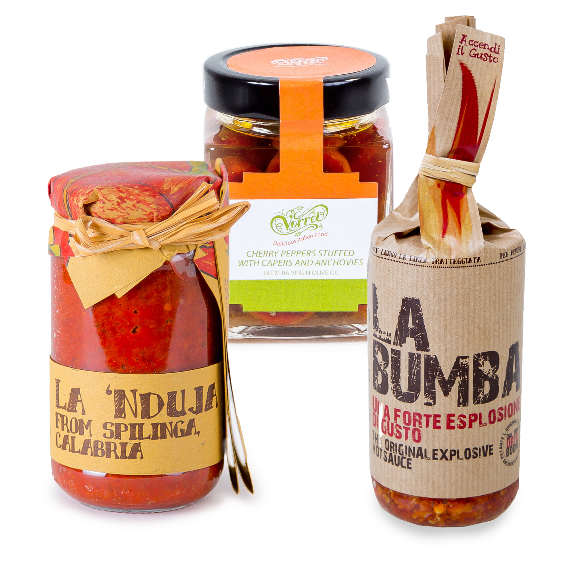 Spicy chilli peppers (45%), extra virgin olive oil, anchovies (10%), capers (2%), salt, natural flavours. Acidity regulator: Citric acid, lactic acid.
